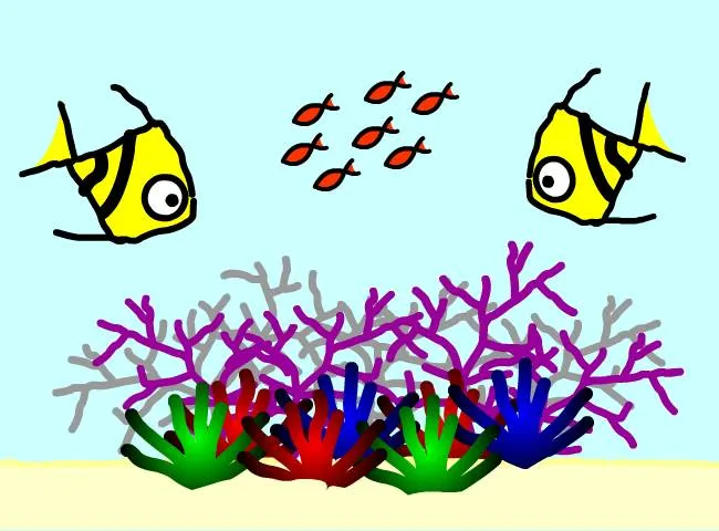 粗眉仔自覺今天精神好了點,便游遠一點點,居然給他發現一塊特大珊瑚礁,附近有極多漂亮的魚兒。為了記念這「壯舉」,粗眉仔決定將之命名為「離岸約五十米外的珊瑚礁」(由於粗眉仔沒有水底攝影機,故用塗鴉代替,請各位見諒。)