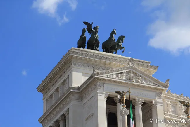 建築的正中央有助巨大的騎馬雕像,馬上是意大利的第一位國王維托里奧·埃馬努埃萊二世(意大利語:Vittorio Emanuele II)。