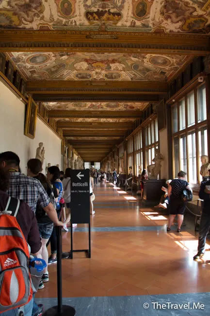 隔離一個房間聚集了一大群遊客,再看清楚,原來是米開朗基羅的《聖家族》,這是米開朗基羅現存唯一一件畫在畫板上的作品,非常珍貴。