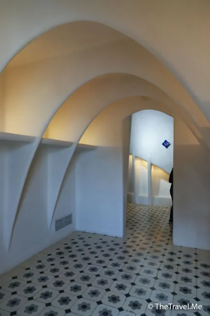 閣樓是工人居住和工作的地方,所以裝修比較簡陋,但仍充滿高弟的設計風格,例如弧形的天花線和牆腳線。
