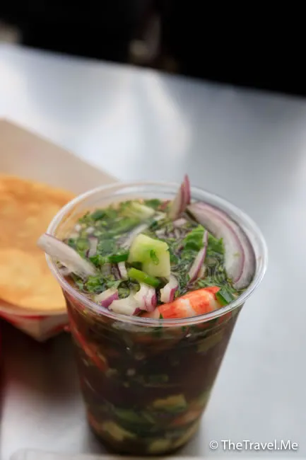 在美國吃到的當然是改良版,所用海鮮已經煮熟,裏頭加入切碎的牛油果,清新鮮味又帶點香滑,好食到唔停得口,隨餐附送脆脆粟米片,點汁食好鬼滋味。