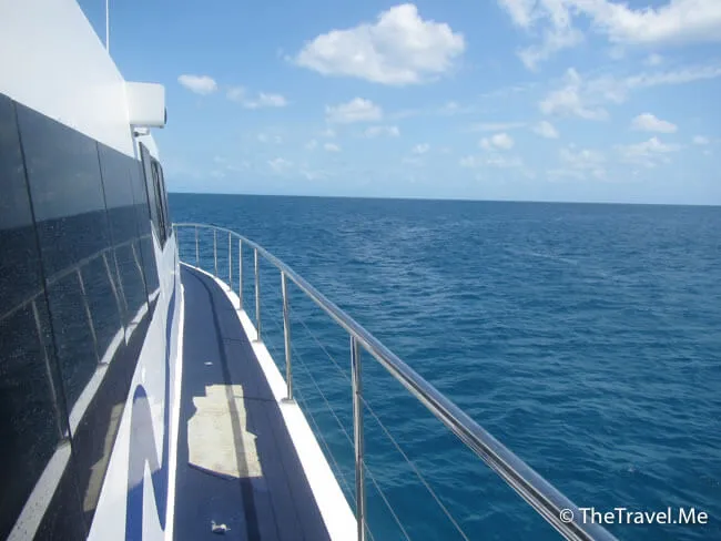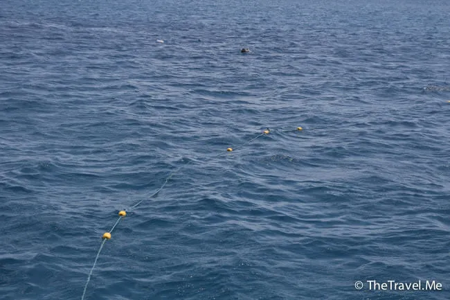 粗眉仔返回船上後才發現,船後的一小片海域有些浮標之類的物體,船職員圍了一個防鯊網,確保旅客不會被鯊魚咬到。