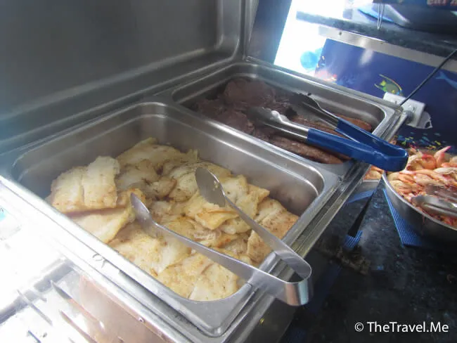 食物主要是肉類,味道遠比想像中好,粗眉仔吃了兩大碟,希望等會浮潛時不會嘔吧……