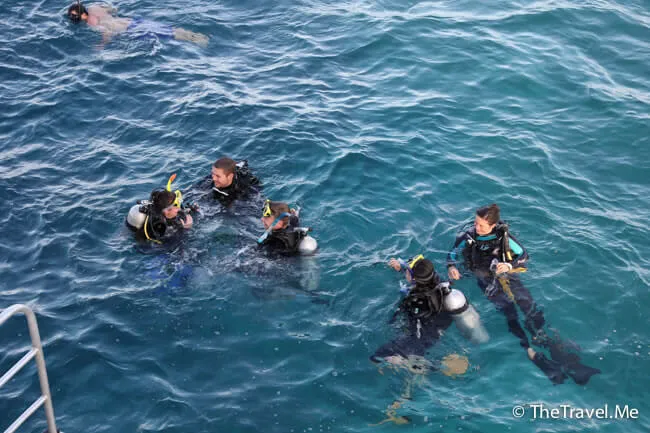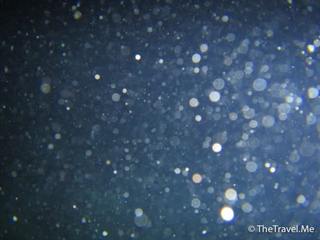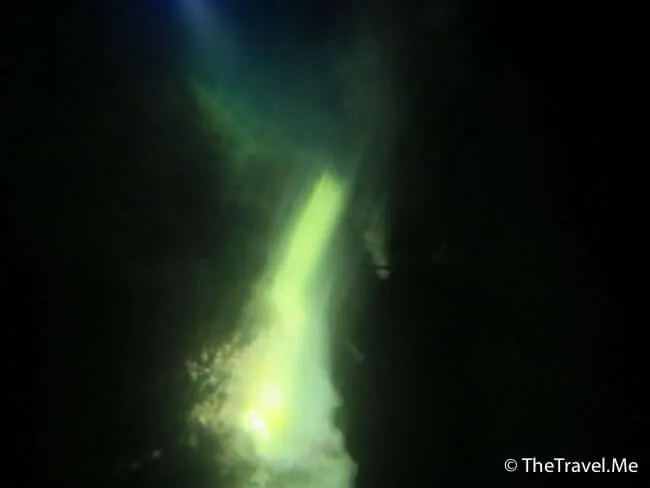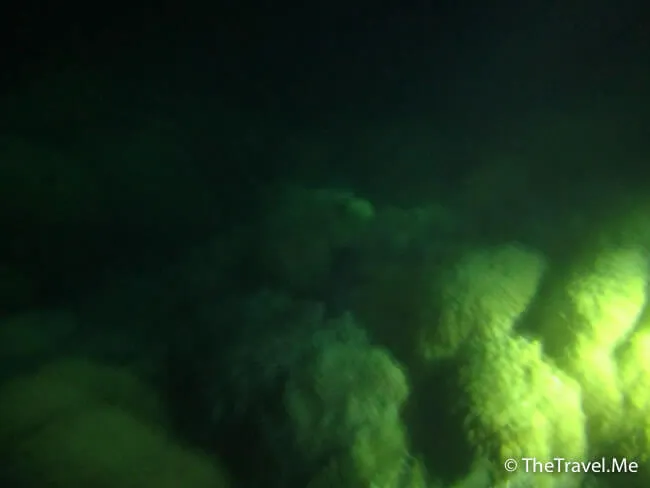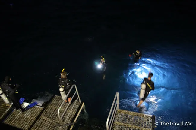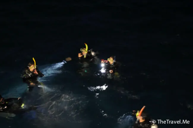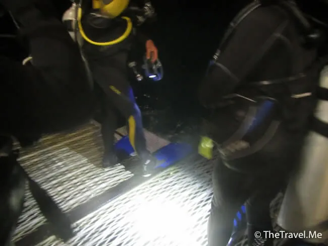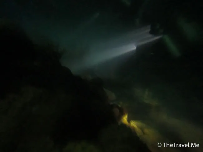 由於是夜潛,所有人都小心翼翼,沿著船邊的繩沉落海底。教練帶頭,後面的一個跟一個,只要有人帶,自己又聽聽話話,夜潛其實可以很安全。