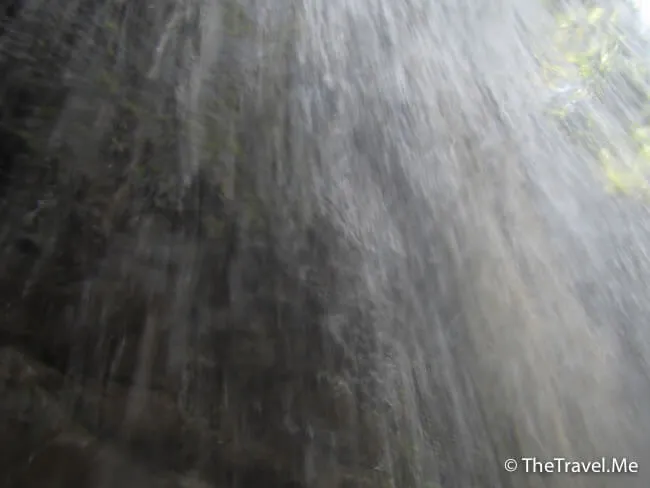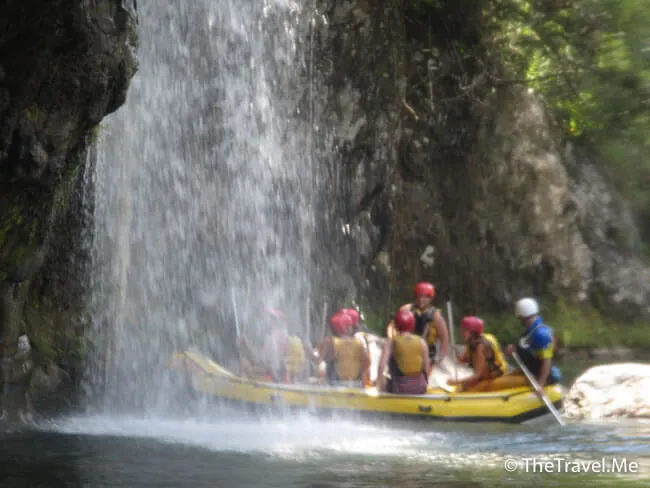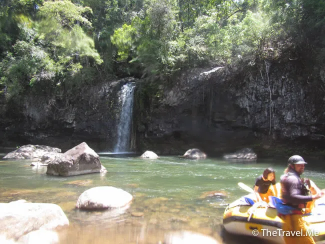 在船長的指示下,橡皮艇在瀑布下面駛過,瀑布水力驚人,打得人人都抬不起頭來。