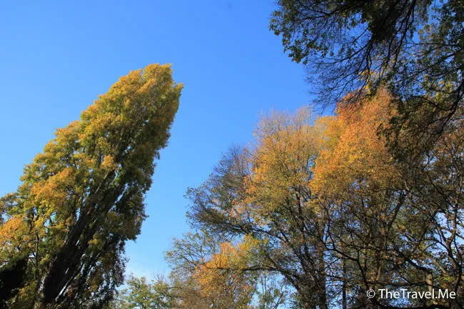 教堂古樸的石頭外牆,配上晨光和秋樹,非常懷舊迷人。
