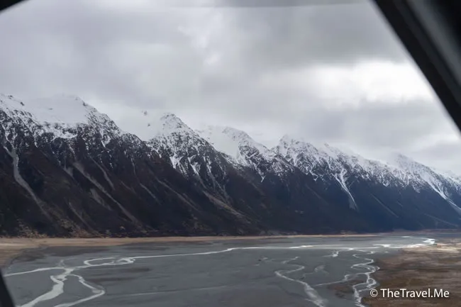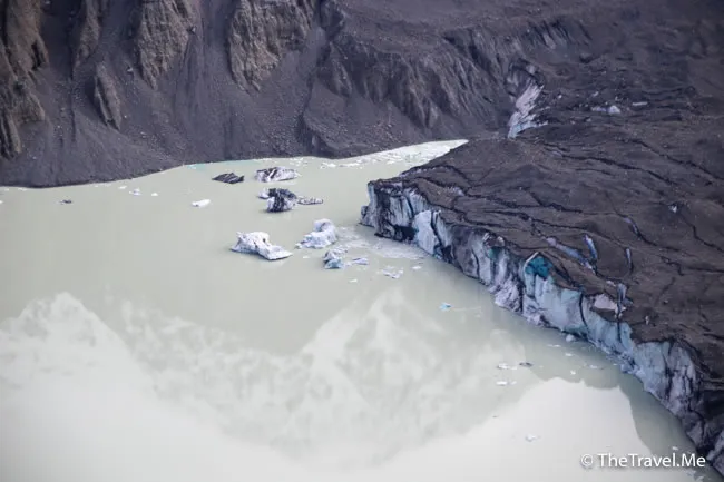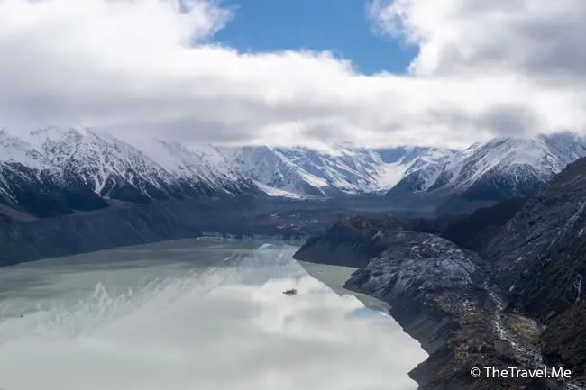 直升機好快就飛到塔斯曼湖(Lake Tasman),這也是個冰川湖,如果角度合適,可以看見漂亮的倒影。