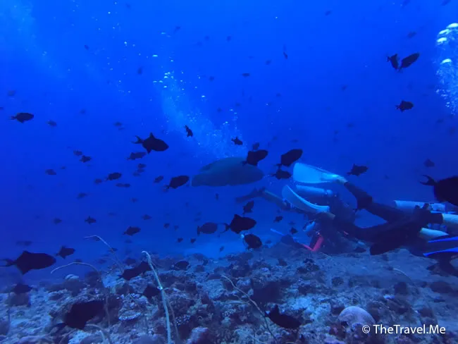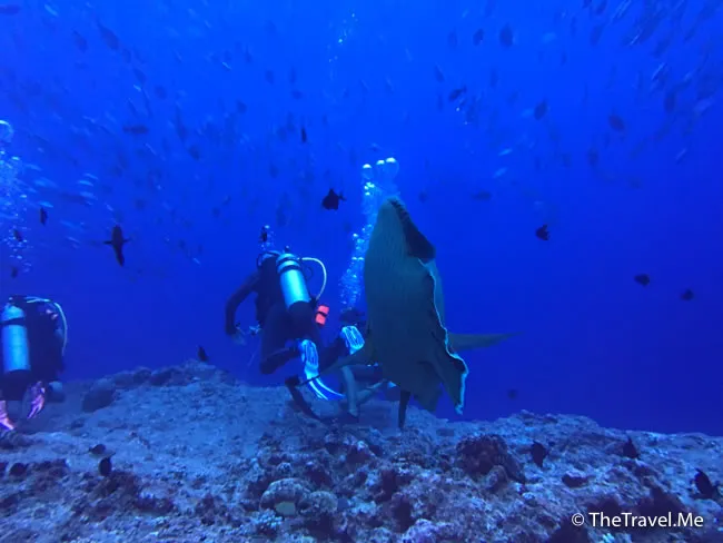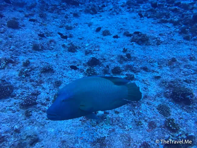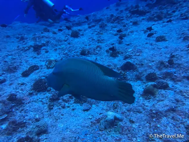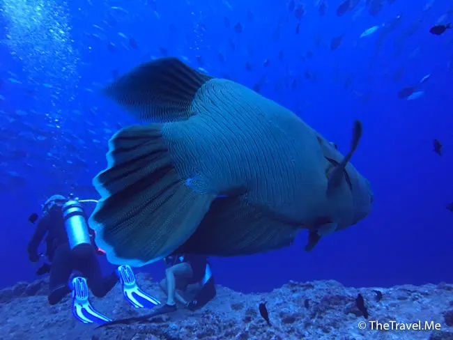 巨形拿破崙仍然在潛水員身邊游來游去,非常佻皮可愛,粗眉仔好想過去摸摸牠。